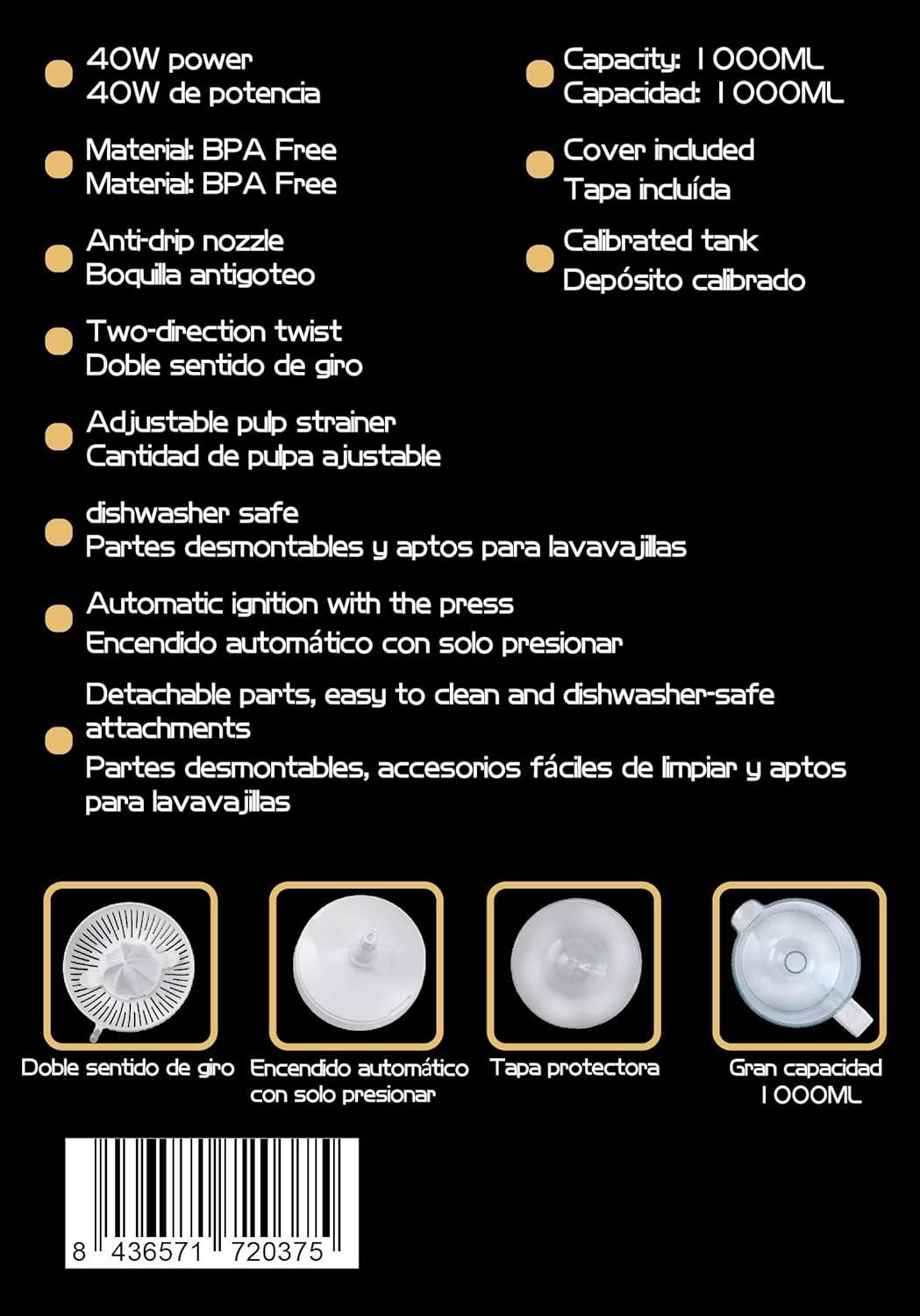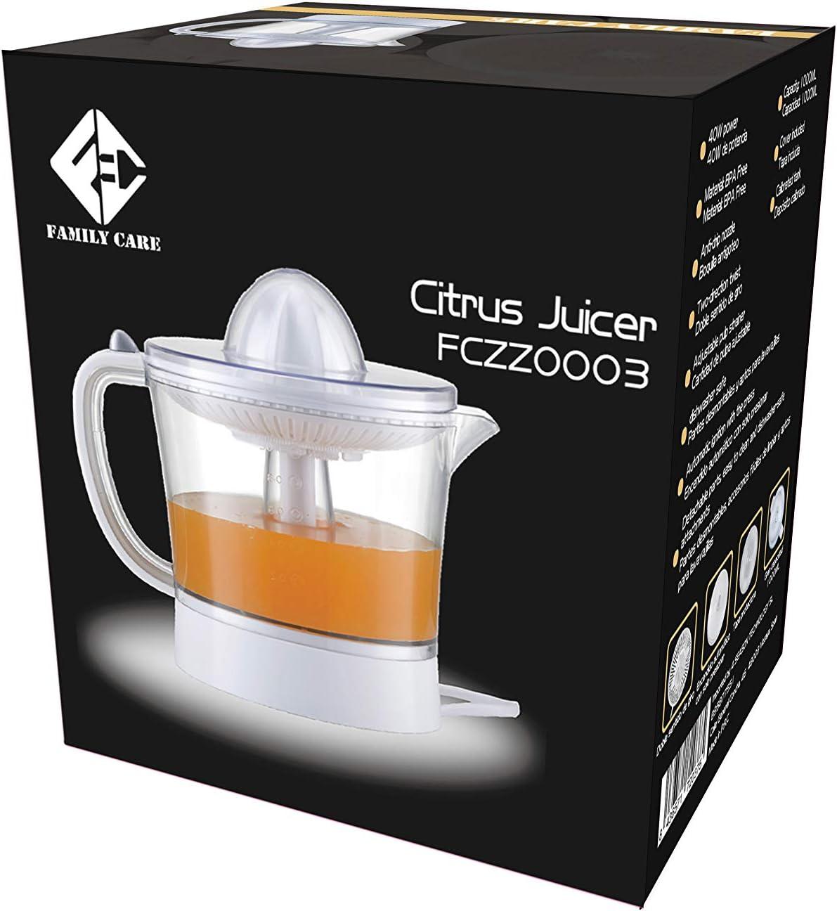 Exprimidor eléctrico de naranjas para zumo Family Care, jarra libre de BPA con 1000ml, filtro de pulpa ajustable, boquilla antigoteo, accesorios desmontables apto para lavavajillas, potencia 40W