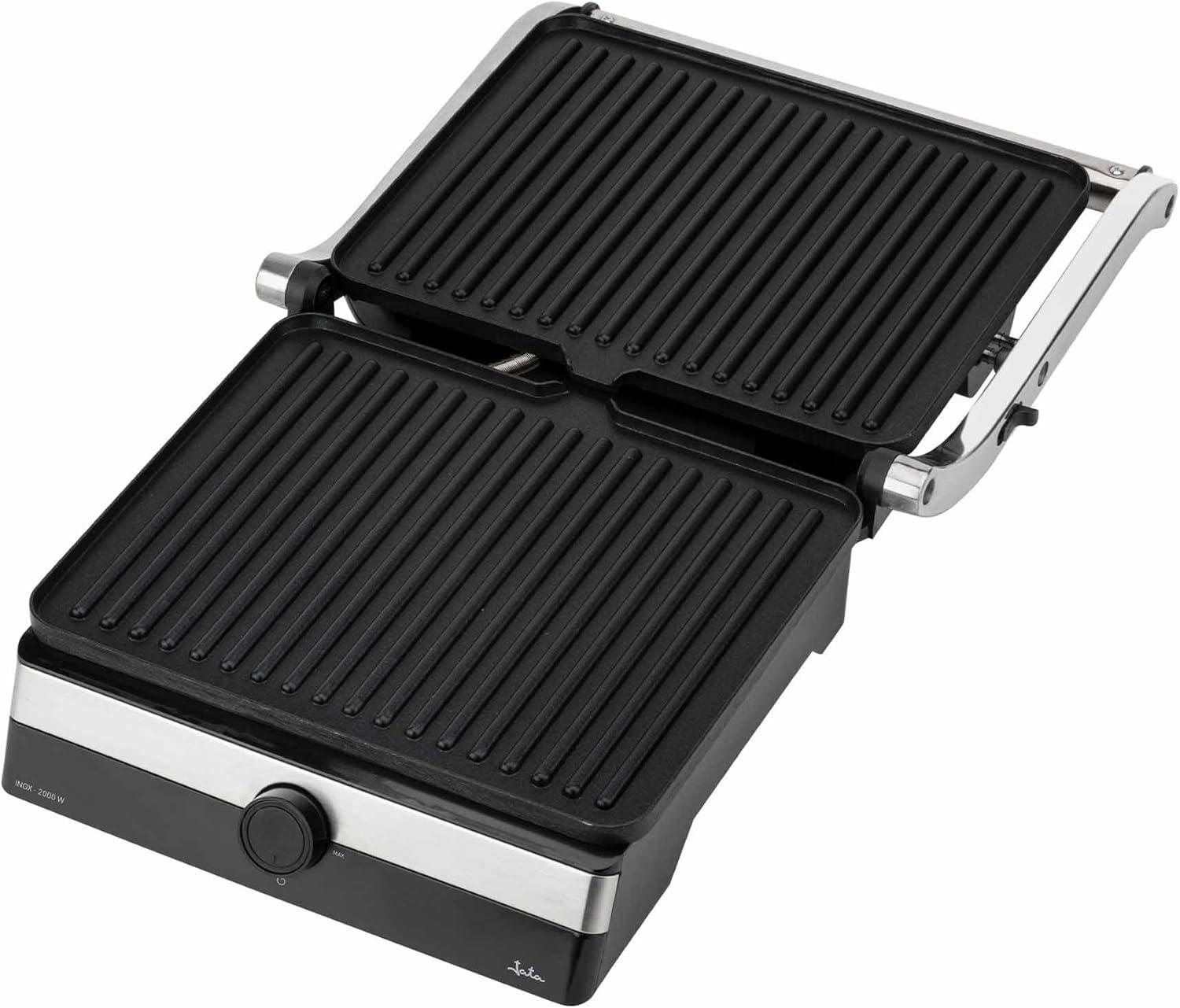 Parrilla Electrica y Grill JATA con placas rayadas antiadherentes de 29 x 23,6 cm. 2000 W. Cocina todo tipo de alimentos. Apertura 180º. Tapa superior basculante. Bandeja recogesalsas