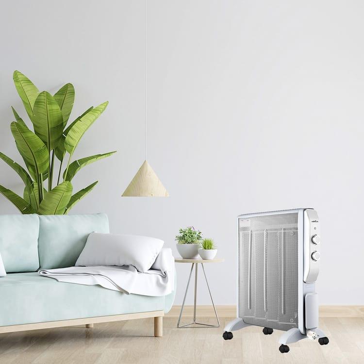 Radiador de Mica eléctrico de la serie ABRIGO en color BLANCO/PLATA. Realizado en metal, policarbonato y mica. Equipado con 2000 watios de potencia repartidos en sus 4 elementos calefactores de mica, y con dos niveles a elegir, 1000w y 2000w, que permiten calentar rápidamente y eficazmente con bajo consumo cualquier estancia, emitiendo calor por ambas caras, de manera segura y silenciosa. Viene con control de Termostato Ajustable, sistema de protección sobrecalentamiento, Antivuelco y luz indicadora de encendido. Se presenta con un diseño elegante y fácil de transportar gracias a su tamaño y a las ruedas que contiene, y posee un útil recogecable en su estructura para una mayor seguridad. Tiene unas dimensiones de 61,5x56x26,5 centímetros.