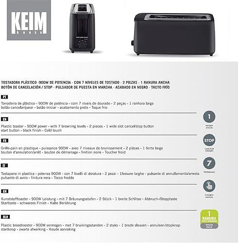 Tostadora eléctrica de alta calidad con una potencia de 900W, diseñada para ofrecer un rendimiento eficiente y un tostado perfecto. Sus dimensiones compactas de 350x110x170mm la hacen ideal para cualquier cocina, mientras que su ranura extragrande de 250x40x110mm permite tostar hasta dos rebanadas de pan de diferentes grosores de manera uniforme. Dispone de 7 niveles de ajuste para un tostado personalizado, seleccionables mediante un práctico selector giratorio. Incorpora un botón de cancelación que permite detener la función de tostado en cualquier momento, garantizando mayor control y seguridad. Además, incluye una función de extra-elevación para facilitar la extracción de las tostadas, evitando quemaduras. Equipada con laterales de diseño táctil frío para garantizar la seguridad y un sistema de centrado automático que asegura un tostado uniforme, esta tostadora destaca por su fabricación en policarbonato (PC) con un elegante acabado negro. Además, incorpora una bandeja recogemigas extraíble que facilita su limpieza y, gracias a su diseño compacto y ligero, presenta un peso de tan solo 1.122 gramos.j