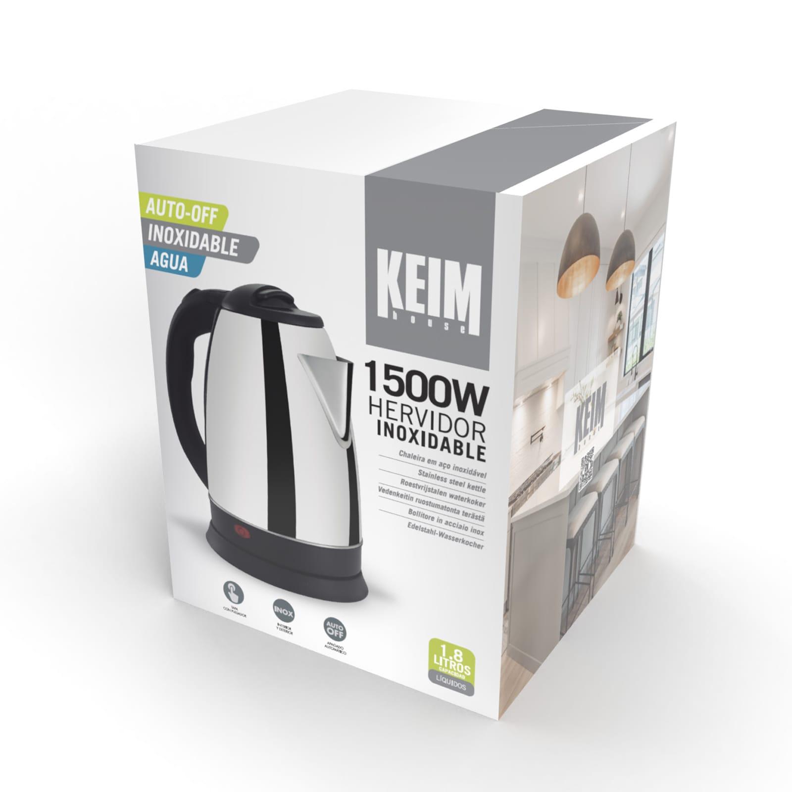 Hervidor de Agua Eléctrico KEIM HOUSE1500W, Capacidad 1.8L, Acero Inoxidable, LED Indicador Encendido, Apagado Automático, Termostato, Tapa Hermética con Pulsador, Base de 360°, Filtro Incorporado: Hervidor de agua eléctrico con 1500W de potencia y capac