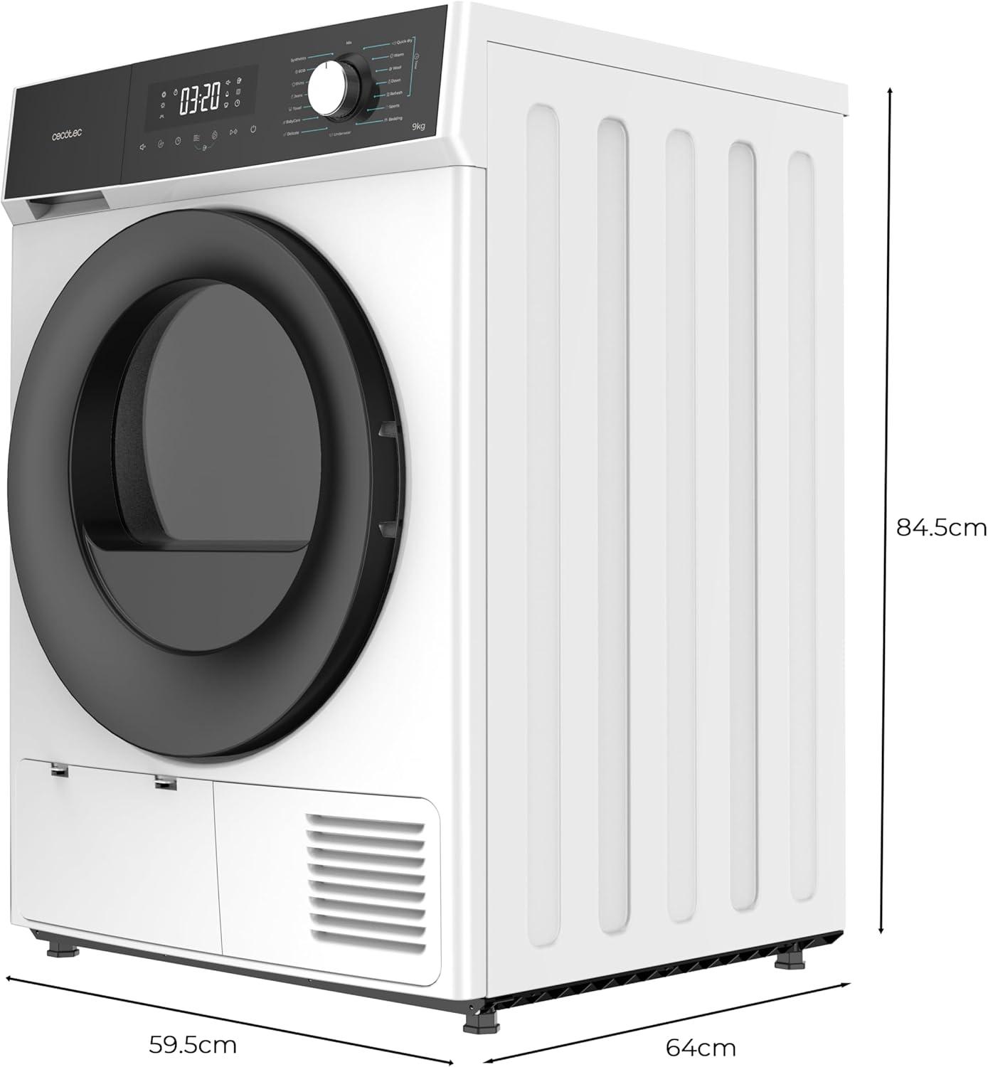 Secadora bomba de calor Cecotec 9kg, clase E (equivalente a clase A++), 15 programas y funciones como secado automático, giro bidireccional del tambor, Planchado Fácil, Stop&Go, Silence, Delay Start y KidLock