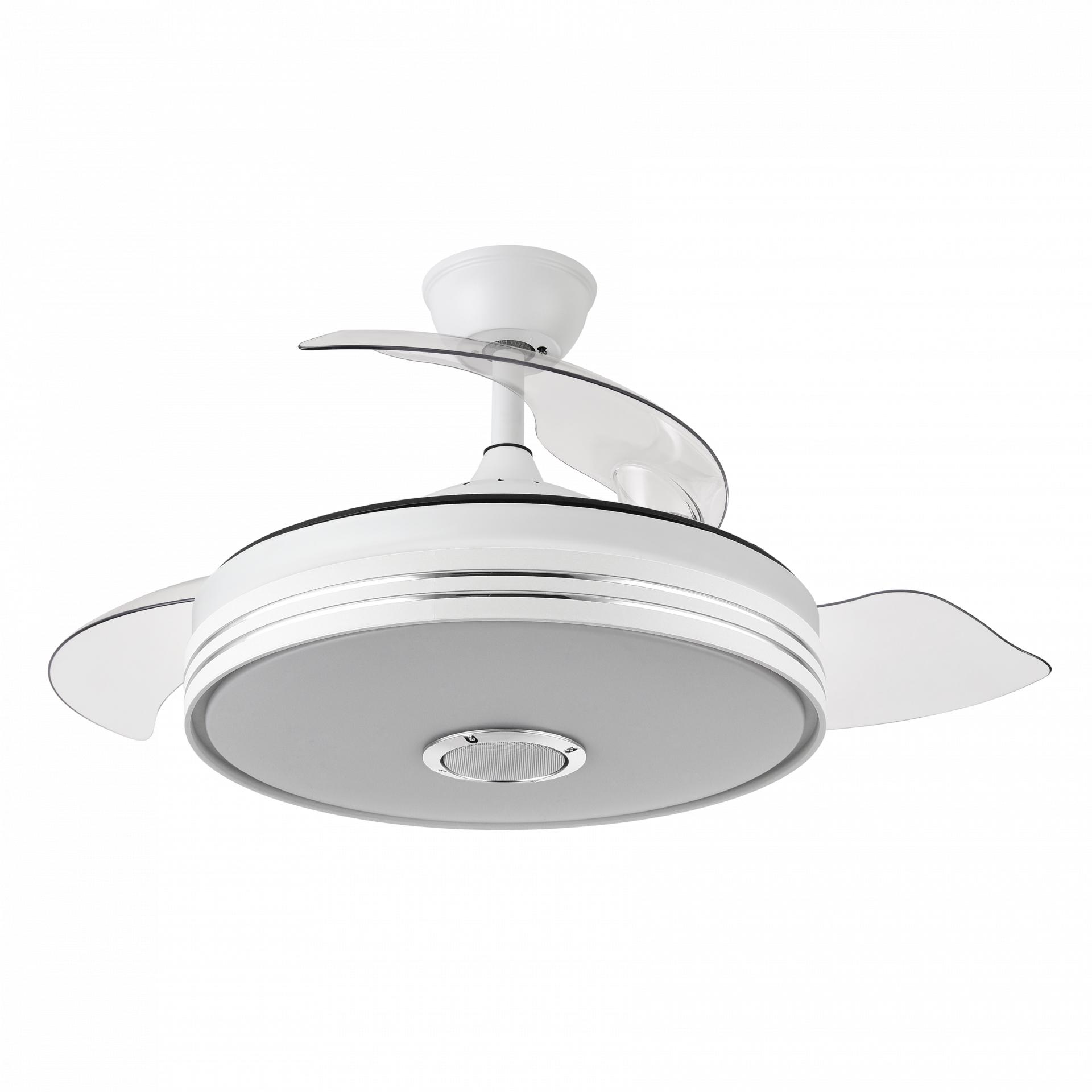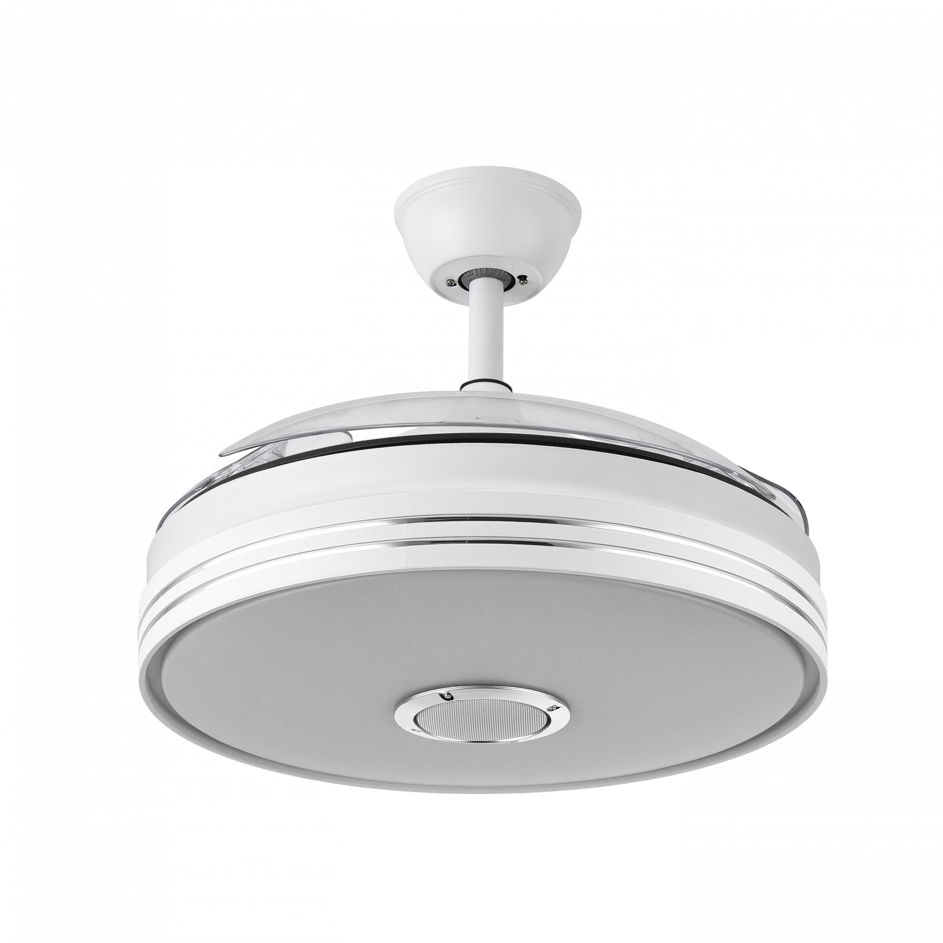 Ventilador MATANUSKA de color BLANCO con tres aspas DESPLEGABLES de ABS muy resistentes de color transparente y seis velocidades. Motor DC .Realizado en metal, policarbonato y ABS. Tecnología LED integrada con una potencia de luz de 72 watios, 6120 lúmenes. Con 3 temperaturas de luz (3000, 4000, 6000 k). Control de aire para verano o invierno. Mando a distancia INCLUÍDO con MEMORIA DE COLOR incorporada y TEMPORIZADOR 1/2/4H. Con ALTAVOZ INCORPORADO y RECEPCIÓN BLUETOOTH . Su medida es de 32/47X55 centímetros con las aspas plegadas y de 32/47X108 centímetros con las aspas desplegadas, con dos medidas de tija para instalarlo a distintas alturas. Modelo también disponible en Níquel.