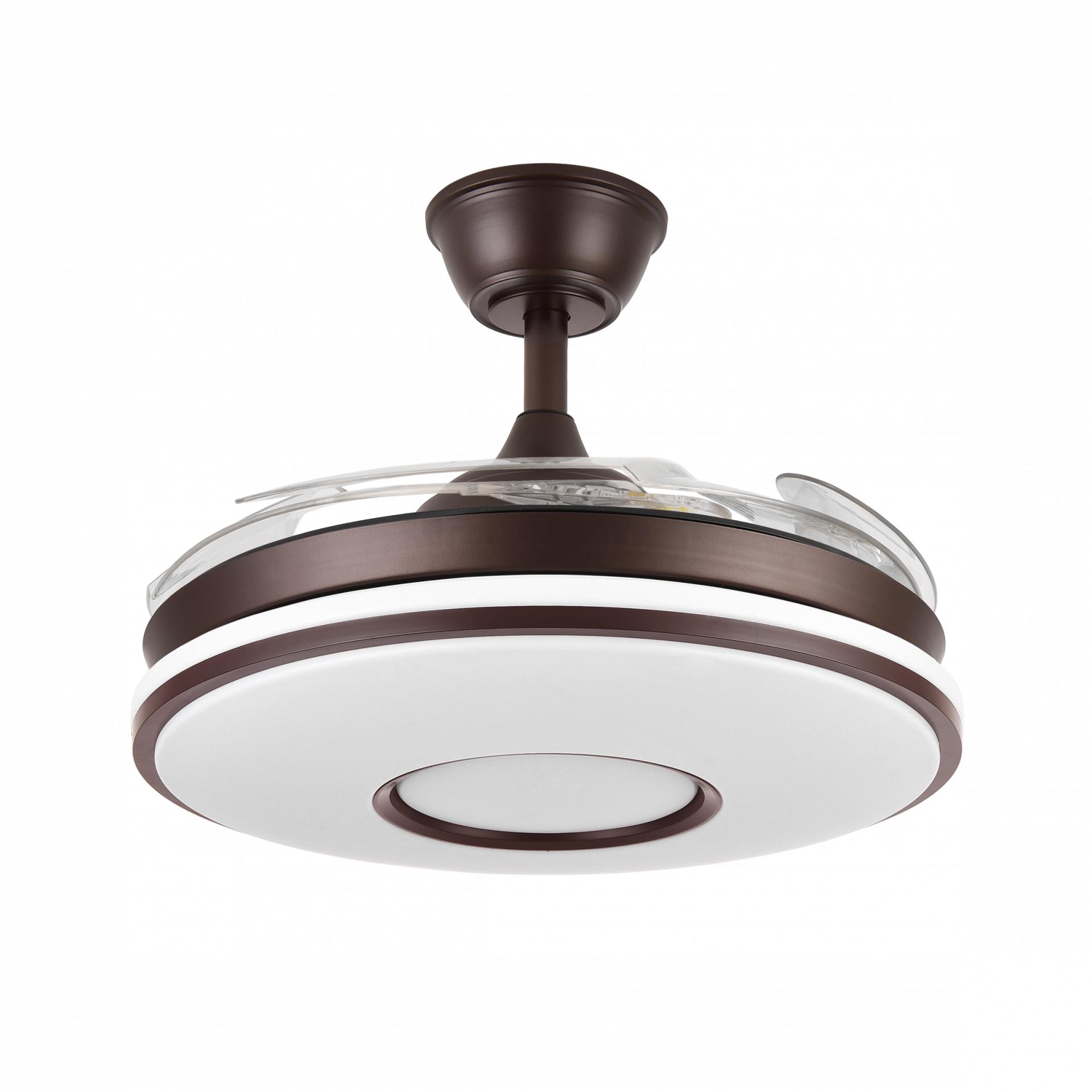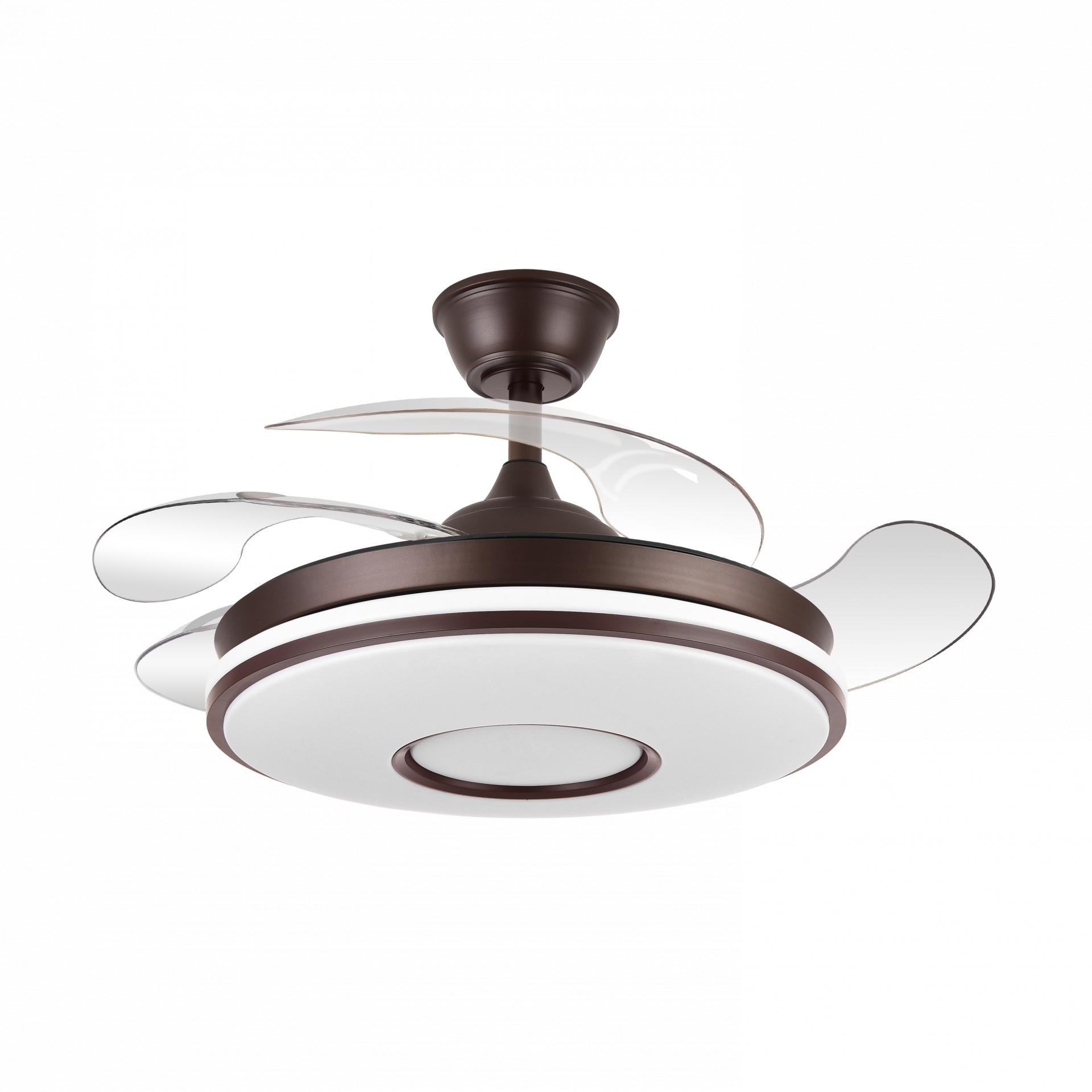 Ventilador DC serie DANI realizado en metal, policarbonato, en color MARRON con cuatro aspas DESPLEGABLES de ABS transparente muy resistentes. Tiene seis velocidades ajustables. Motor DC. Tecnología LED integrada con una potencia de 59W, con 3 TEMPERATURAS SELECCIONABLES DE LUZ (3000-4000-6000K) luz cálida, natural y blanco frío, y 6980 lúmenes. Control de aire verano o invierno. Su medida es de 34,5/42X50 centímetros con las aspas plegadas y de 34,5/42X107 centímetros con las aspas desplegadas. Incluye dos tijas de 12,5 y 20 centímetros, para instalar a distintas alturas. Mando a distancia INCLUIDO, REGULABLE EN INTENSIDAD, con MEMORIA DE COLOR incorporada y TEMPORIZADOR 2/4 H. Modelo disponible en color cuero, blanco, negro, marrón y níquel, además de en dos tamaños diferentes.