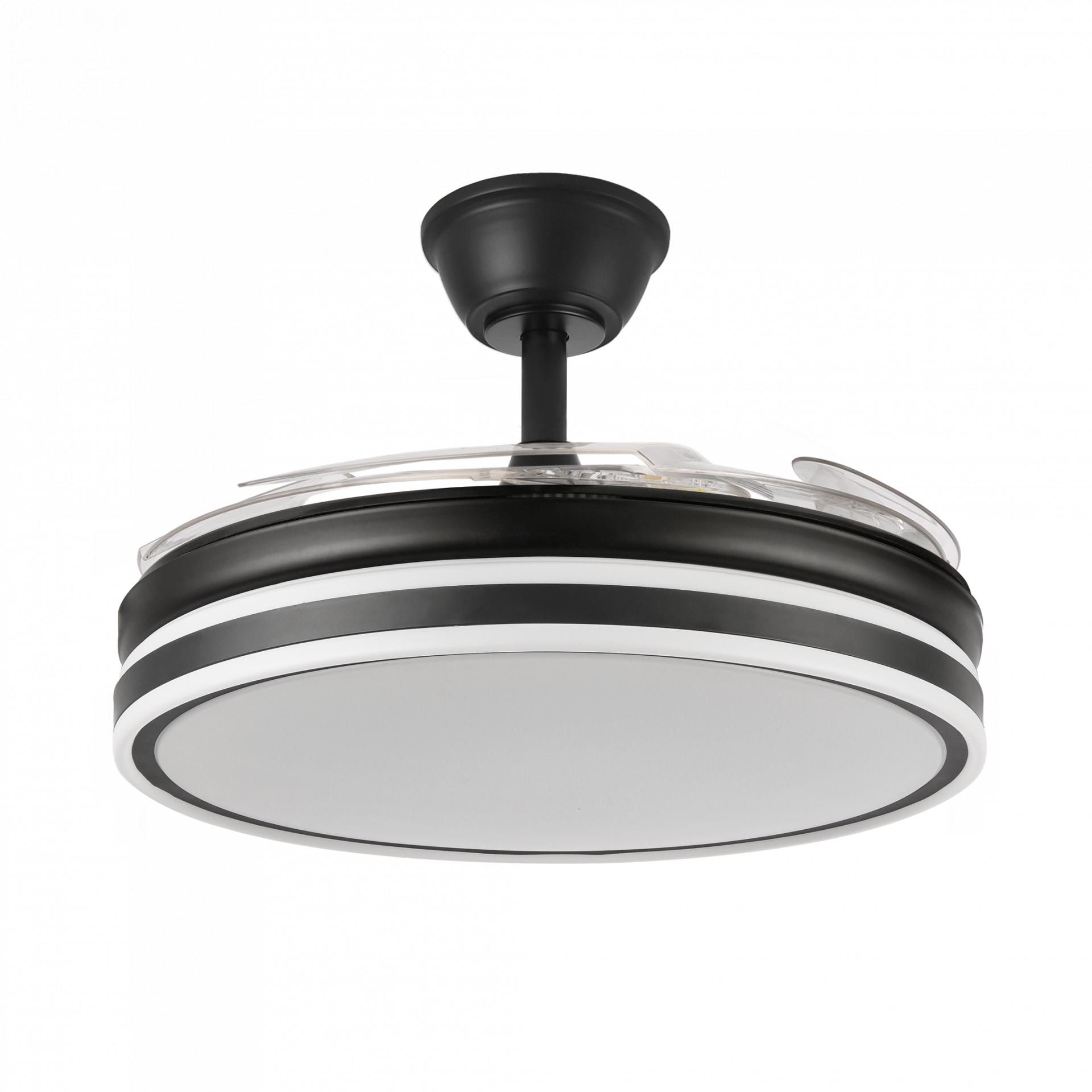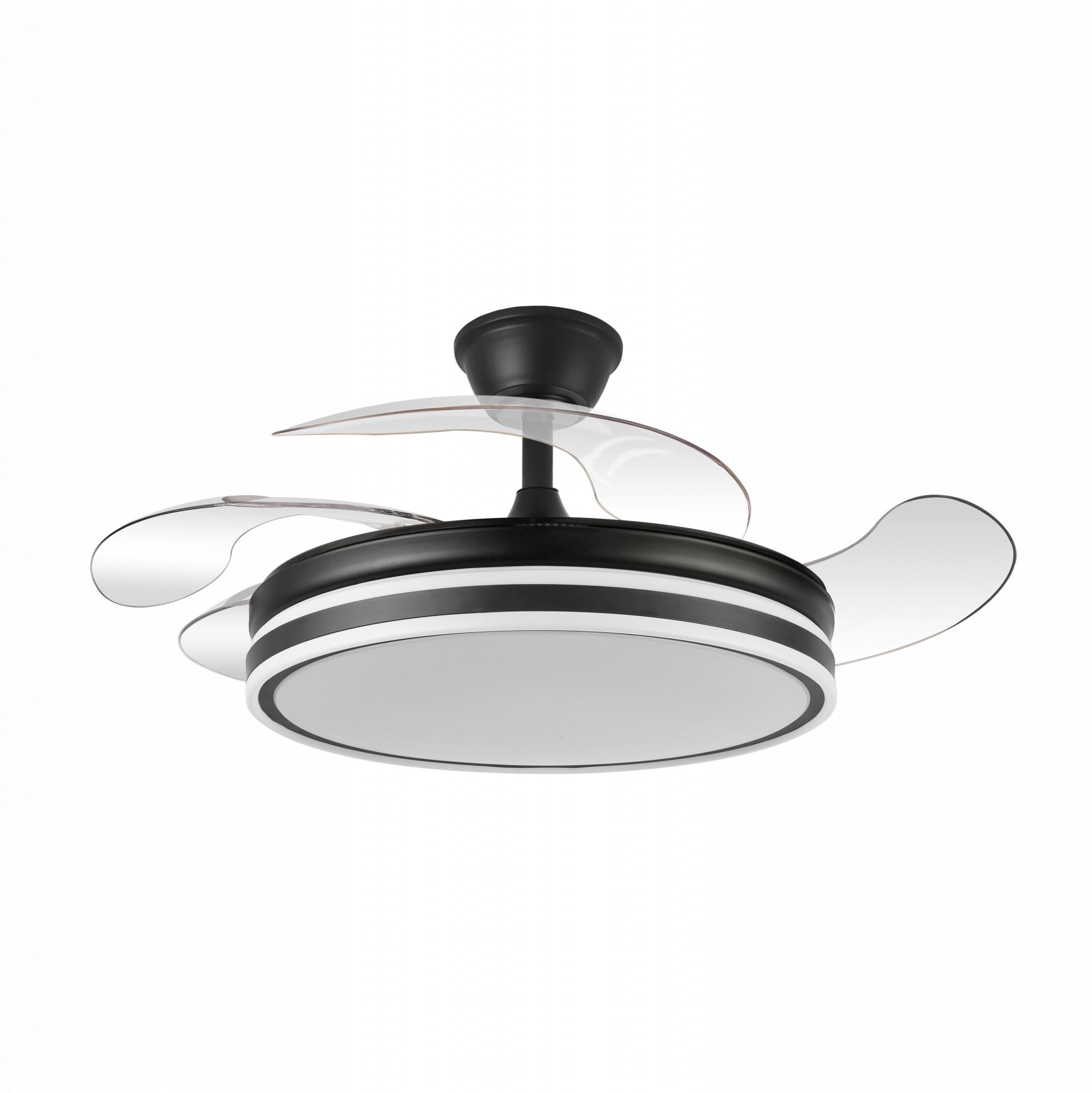 Ventilador BAYOMO realizado en metal y policarbonato, en color NEGRO con cuatro aspas DESPLEGABLES de ABS transparente muy resistentes. Motor DC. Tiene seis velocidades ajustables. Tecnología LED integrada con una potencia de 59W, con 3 TEMPERATURAS DE LUZ (3000-4000-6000K) y 6980 lúmenes. Control de aire verano o invierno. Su medida es de 34,5/42X50X50 centímetros con las aspas plegadas y de 34,5/42X107X107 centímetros con las aspas desplegadas, con dos medidas de tija para instalarlo a diferentes alturas. Mando a distancia INCLUIDO, REGULABLE EN INTENSIDAD, con MEMORIA DE COLOR incorporada y TEMPORIZADOR 2/4 H. Modelo disponible en color Níquel, Cuero, Blanco y en color Negro.