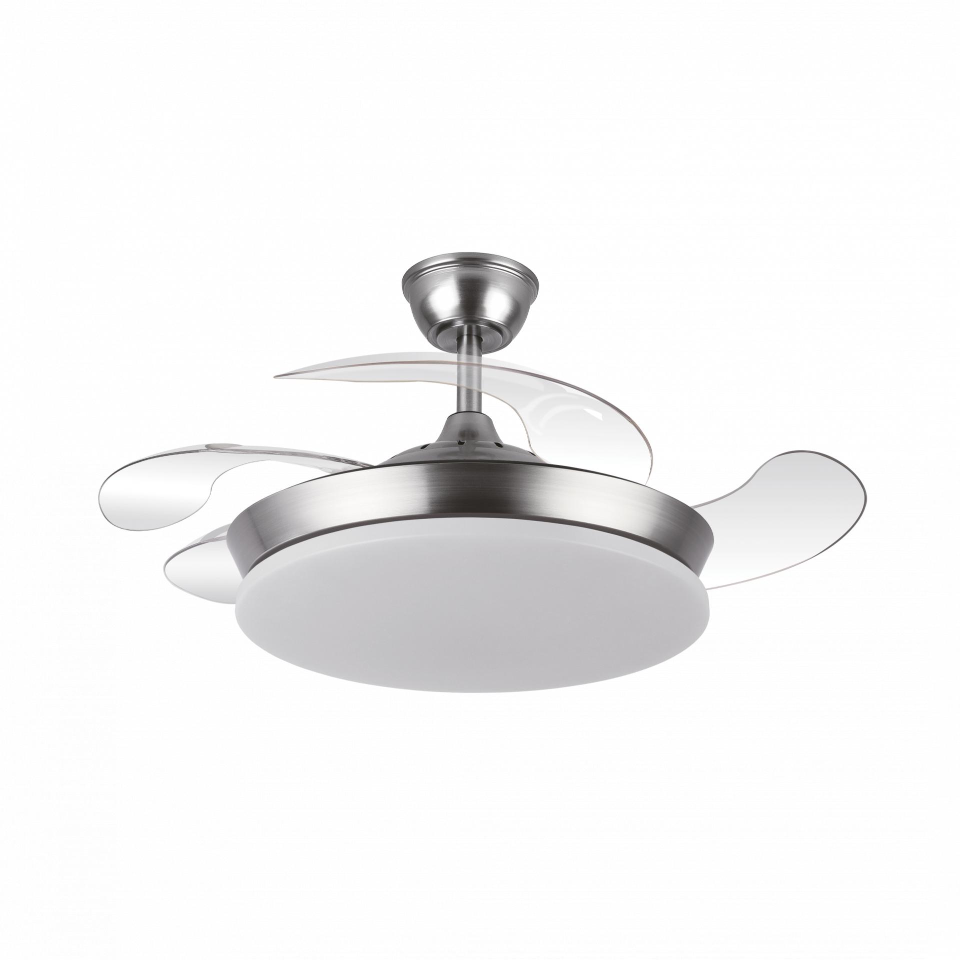 Ventilador DC de la serie TRIDENTE MINI realizado en metal, policarbonato y ABS, en color NIQUEL con cuatro aspas DESPLEGABLES de ABS transparente muy resistentes. De diseño innovador, ideal para completar tanto en decoraciones modernas como clásicas, realizando tanto la función de lámpara como de ventilador. Motor DC con seis velocidades ajustables. Tecnología LED integrada con una potencia de 59W, 6980 lúmenes y 3 TEMPERATURAS SELECCIONABLES DE LUZ (3000-4000-6000K) luz cálida, natural y blanco frío. Es REGULABLE EN INTENSIDAD, con mando a distancia INCLUIDO con MEMORIA DE COLOR incorporada y TEMPORIZADOR 2/4 H. Control de aire verano o invierno. Su medida es de 34,5/42X40 centímetros con las aspas plegadas y de 34,5/42X91 centímetros con las aspas desplegadas. Incluye dos tijas de 12,5 y 20 centímetros, para colocar a distintas alturas. Encontramos en esta serie dos tamaños de ventiladores y en los colores blanco, negro, níquel y cuero, para elegir el más le guste y el que mejor se adapte a su decoración.