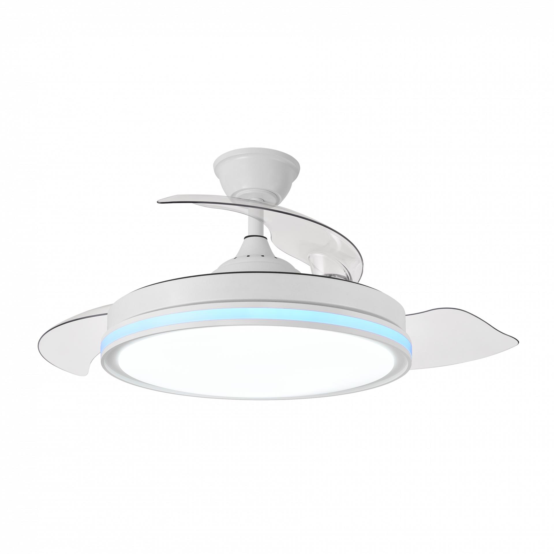 Ventilador DC de la serie CACIQUE realizado en metal, policarbonato y ABS, en color BLANCO con tres aspas DESPLEGABLES de ABS transparente muy resistentes. De diseño moderno y original, posee un aro en su estructura con luces de colores (RGB) con encendido y apagado independiente de la luz principal. Tiene seis velocidades ajustables. Tecnología LED integrada con una potencia de 59 vatios, con 3 TEMPERATURAS SELECCIONABLES DE LUZ (3000-4500-6500K) y 6980 lúmenes + 7 vatios RGB. Control de aire verano o invierno. Su medida es de 34,5/47X50 centímetros con las aspas plegadas y de 34,5/47x107 centímetros si tiene sus aspas desplegadas. Incluye dos medidas de tija para instalar a diferentes alturas. Mando a distancia INCLUIDO, REGULABLE EN INTENSIDAD en su luz principal, con MEMORIA DE COLOR incorporada y TEMPORIZADOR 2 H. Puede utilizar el control VIA APP : FAN LAMP PRO, desde el que podrá manejar también su ventilador de manera fácil e intuitiva desde su móvil y elegir los colores de su aro exterior entre una amplia gama de tonalidades. Modelo disponible en color blanco y en negro.