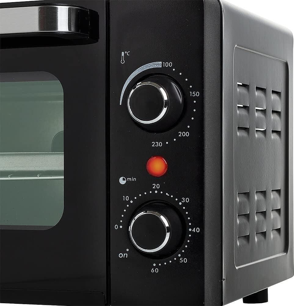 Como ya hemos mencionado, este minihorno puede colocarse fácilmente en espacios pequeños. ¿Tienes poco o nada de espacio en la encimera de la cocina? ¡No hay problema! Además, el horno es ligero, por lo que podrás guardarlo en un armario. Asimismo, cumple el nuevo marcado CE, así que es muy seguro de usar y está equipado con una puerta con doble acristalamiento.