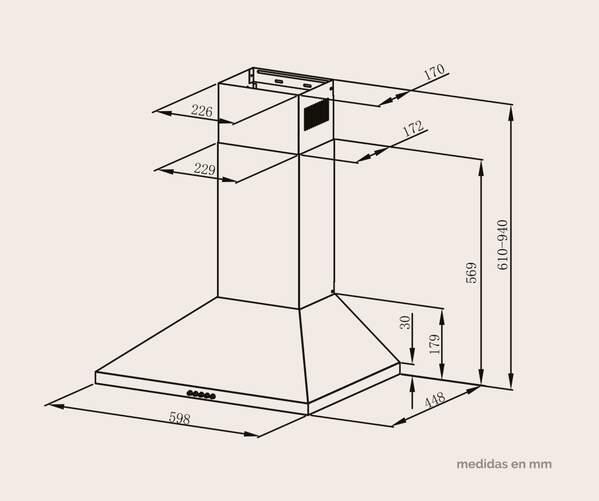 Con un diseño piramidal clásico en acero inoxidable, combina estética y funcionalidad. Cuenta con luz LED para una visibilidad óptima y dos filtros antigrasa de aluminio de 5 capas, fácilmente extraíbles y lavables. Con una capacidad de extracción de 400 m³/h, tres velocidades y motor de 115 W, ofrece un rendimiento eficiente con un bajo nivel sonoro de 65 dB. Clase energética B.