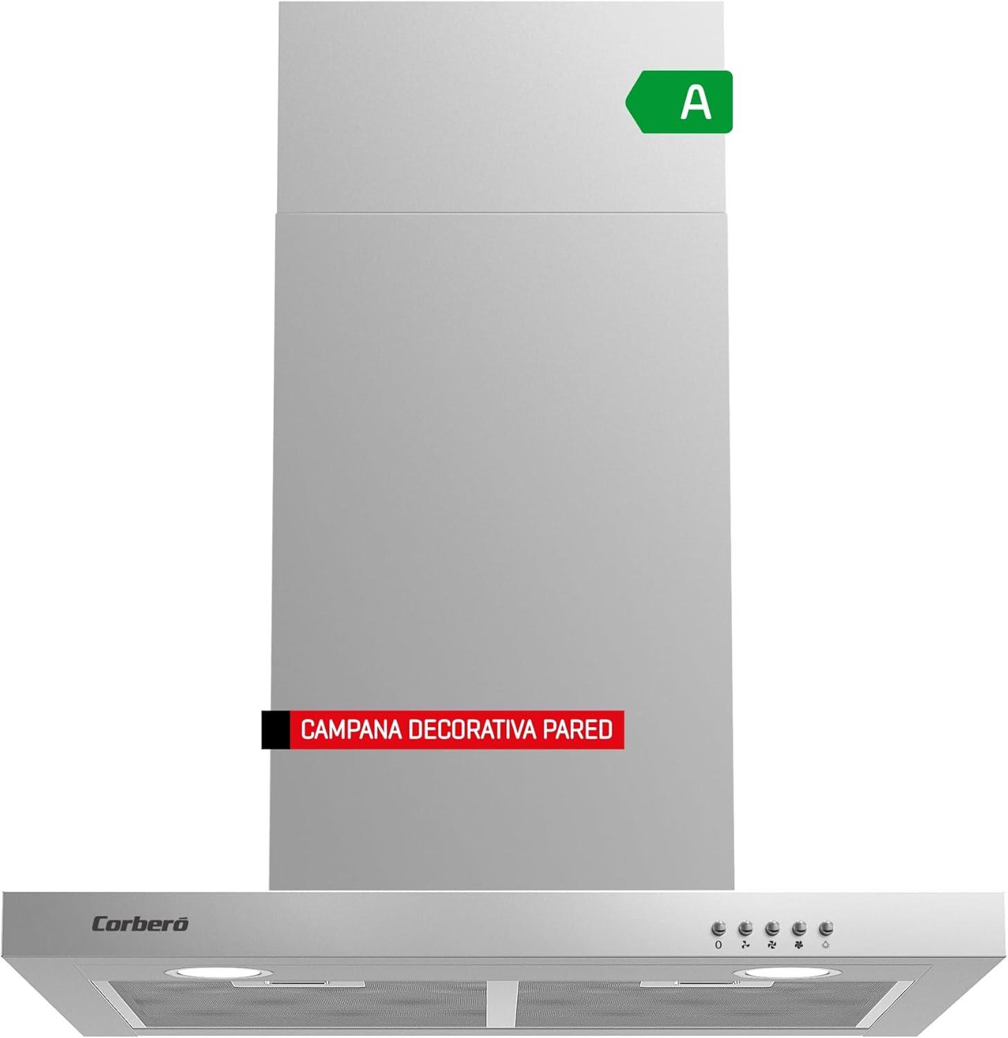 Campana Extractora Corberó - Horizontal 60 cm | 647,7 m3/h | 71 db| 165W | 3 Velocidades | Control por pulsador| 2 Filtros de Aluminio + Filtro Carbón | Inox [Clase de eficiencia energética A]