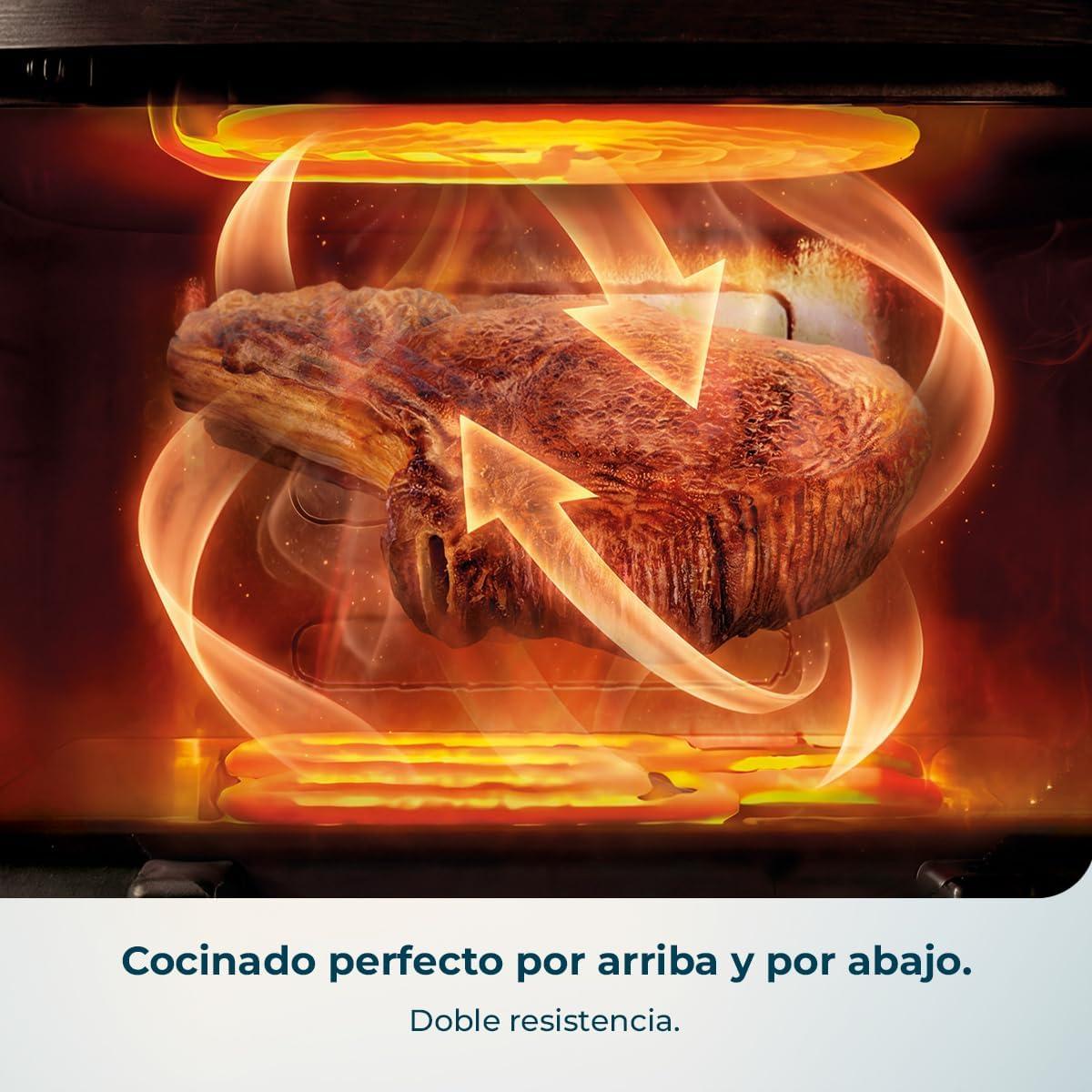 - Cocción envolvente y rápida. Doble resistencia que reparte el calor de manera uniforme, asegurando una cocción perfecta sin necesidad de girar los alimentos.